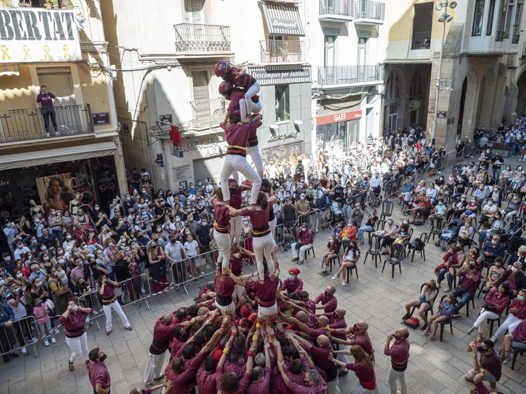 L’actuació d’avui ha estat en exclusiva dels Castellers de Lleida, que han entrat a la plaça amb un pilar caminant, n’han dedicat un de dol, a les persones que ens han deixat a conseqüència de la Covid, i han aixecat altres tres castells (3d6, 4d6 i 4d6 amb folre), abans d’acomiadar-se amb els darrers pilars i l’enlairada de l’enxaneta fins a la finestra del Palau de la Paeria.