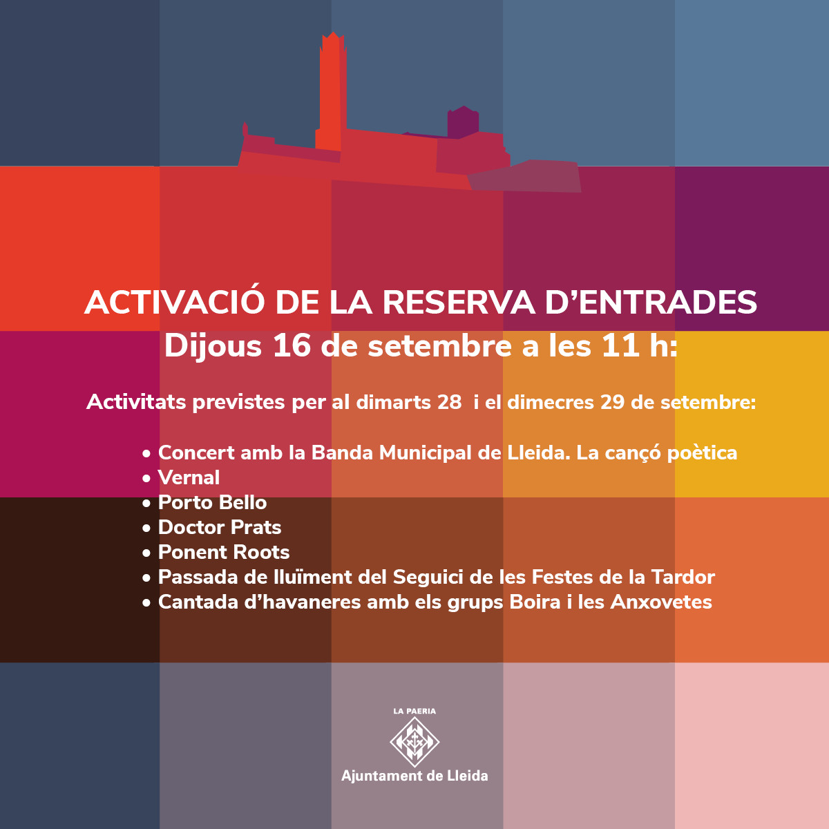 Demà, dijous, a les 11 hores, s’obre la reserva d’entrades per a set actes previstos per al dimarts 28 de setembre i el dimecres 29 de setembre que són el concert amb la Banda Municipal de Lleida. La cançó poètica, Vernal, Porto Bello, Doctor Prats, Ponent Roots, Passada de lluïment del Seguici de les Festes de la Tardor i la cantada d’havaneres amb els grups Boira i les Anxovetes.