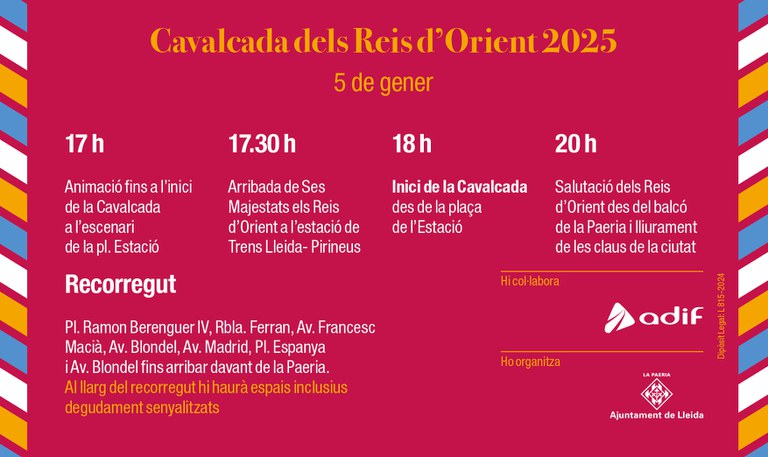 - Recorregut cavalcada: Pl. Ramon Berenguer IV, Rbla. Ferran, Av. Francesc Macià, Av. Blondel, Av. Madrid, Pl. Espanya i Av. Blondel fins arribar davant de la Paeria. Al llarg del recorregut hi haurà espais inclusius degudament senyalitzats